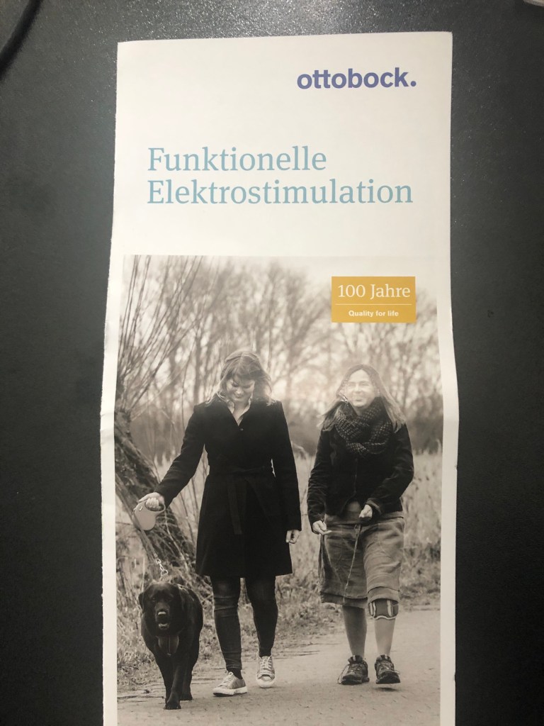Wegen meiner Fussheberschwäche probieren wir morgen eine elektronische Manschette am Bein bei John + Bamberg, einem Sanitätshaus hier ganz in der Nähe. Durch einen elektrischen Impuls durch das Steuergerät wird der Fuß bei der Fußhebung unterstützt.