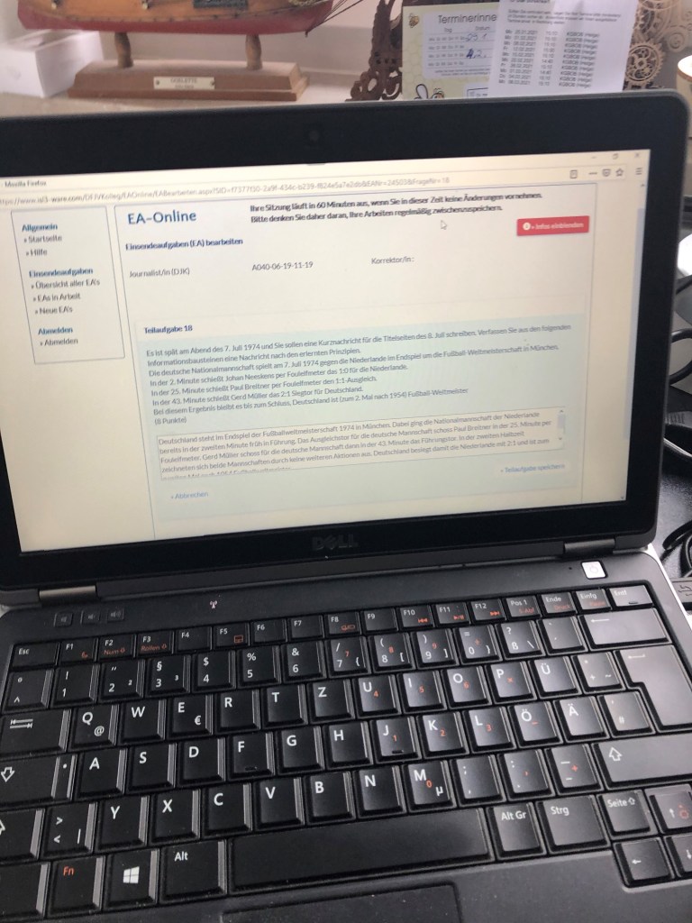 Langsam habe ich den Bogen wohl raus. Für diese Woche habe ich mir die Übung zum Thema Journalistische Stilistik vorgenommen. Als Erstes habe ich mir die Fragestellungen der Hausaufgabe angesehen. Danach die fünf Kapitel des Studienbriefs auf die Wochentage verteilen. Jeden Tag bearbeite ich ein Kapitel und die zugehörigen Punkte der Hausaufgabe. Samstag bearbeite ich dann die Hausaufgabe final und gebe sie ab, wenigstens so ist es geplant. Das ist momentan ein etwas einsames Geschäft. Ich würde mir etwas Kontakt zu Referenten und Mitstudenten wünschen. Wie viel soll ich zu jeder Frage schreiben? Die jeweiligen Felder dazu sind sehr klein, theoretisch kann man aber durch scrollen unendlich lange Texte hinterlegen. Fragen über Fragen, die mir zur Verfügung gestellte Dokumentation des Anbieters gibt mir hier wenig Aufschluss. Ich halte mich an den Grundsatz, wenig Punkte gleich kurzer Text, viele Punkte gleich längerer Text.