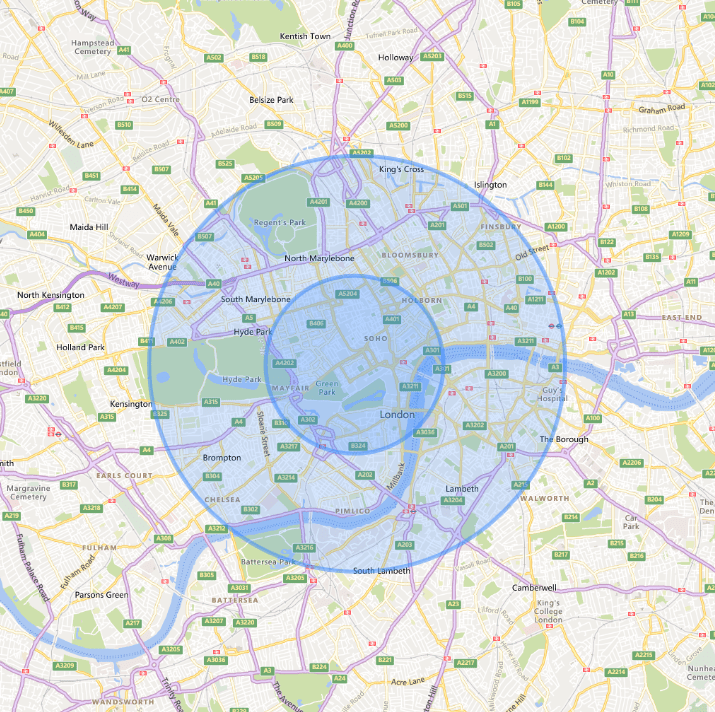 Daran habe ich mich jetzt erinnert und die Radien und damit mein neu gewonnene Freiheit über eine Stadtkarte von London gelegt. Mit den digitalen Möglichkeiten kein Problem. Schaut mal, was ich jetzt schon ohne Pause zu Fuß erreichen kann (äußerer Kreis)? Ohne das Fußhebersystem hätte ich lediglich die Ziele im inneren Kreis per pedes ohne Unterbrechung ansteuern können.