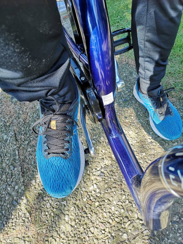 Ich kann mein betroffenes Bein (rechts) nicht ganz gerade auf die Pedale setzen. Dadurch steht der Fuß nach außen und schlägt hinten mit der Ferse an das Kettenschutzblech an. Das hatte ich schon in der Reha. Die Fitnessfahrräder waren für mich damals ebenfalls schwierig. Für mich ist es nicht selbst möglich, auf dem Rad den rechten Fuß noch einmal neu umzusetzen. Ihr seht mein Dilemma auf dem Bild.