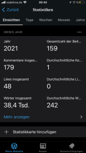 Ich war aber auch ebenfalls fleißig. In 2021 habe ich sage und schreibe 159 Artikel erstellt. Mir macht das Schreiben wirklich Spaß und ich kann dabei gut meine Gedanken ordnen. Im nächsten Jahr werden es vermutlich ein paar weniger Beiträge. Grund dafür ist mein neuer Vollzeitjob. Und das Thema Schlaganfall wird wohl auch nicht immer ganz so im Mittelpunkt stehen. Andere Themen werden das Thema etwas weiter in den Hintergrund drängen, und das ist gut so für mich.