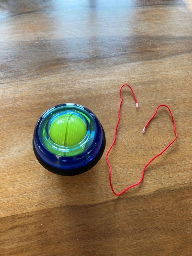 Und der Ball ist nicht ohne. Man muss die Kugel im Ball in Bewegung halten, nachdem er über eine Kordel in Rotation gesetzt wurde. Am besten kann das meine Tochter Sarah. Mir gelingt das Starten noch nicht so gut. Daher wirft sie für mich den Ball an und übergibt ihn mir dann. Beim Bewegen treten ziemliche Kräfte auf. Nach 10 Minuten hat selbst Sarah das Gefühl, der Arm fällt ab.