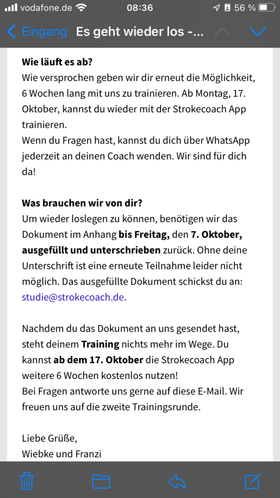 Heute habe ich überraschend eine E-Mail der Firma Strokecoach bekommen. Es könnte mit der Studie weitergehen. Kostenlos wiederum für 6 Wochen.
