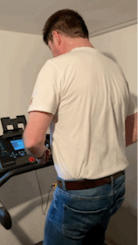 Ich habe mir einen Triathlon vorgenommen. Erst 8 Minuten frei gehen, ohne festhalten. Arme alternierend zu den Beinen bewegen. Für mich als Schlaganfallbetroffenen auch zweieinhalb Jahre nach dem Ereignis immer noch nicht ganz selbstverständlich. Ich nenne das meine kognitive Phase. Laut Anzeige ist hier meine optimale Geschwindigkeit, bei der ich noch die Balance halten kann, 2,8 km/h.