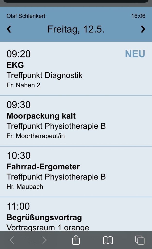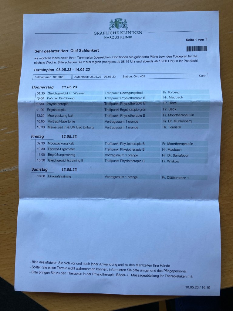 Ich war in meinen letzten Beiträgen ziemlich kritisch mit meiner aktuellen Rehaeinrichtung. Es gibt aber auch Dinge die besser gelöst sind als in Hessisch Oldendorf. Beide Einrichtungen setzen bei der Therapieplanung gewohnt auf Papier.