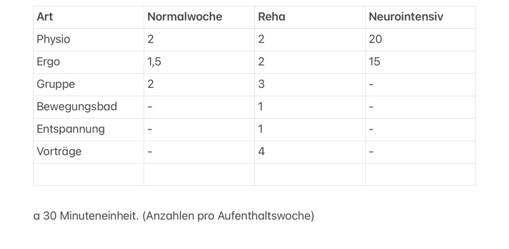 Ich habe lange überlegt, wie ich euch mein Problem mit der Therapiedichte in meiner Reha erklären kann. Das Problem, Es gibt über die Woche gesehen, einfach zu wenig Therapie. Zur Erklärung habe ich eine Tabelle angelegt.