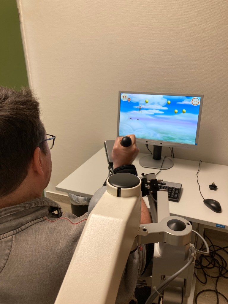 Seit dieser Woche bekomme ich zusätzlich Armtraining in meiner Reha. In einer besonderen Form der Ergotherapie. Ich sitze in einem Exoskelett für meinen rechten Arm und muss am Rechner spielerisch Aufgaben lösen. Wenn ihr mal sehen wollt, wie das aussieht, einfach auf den Link klicken.