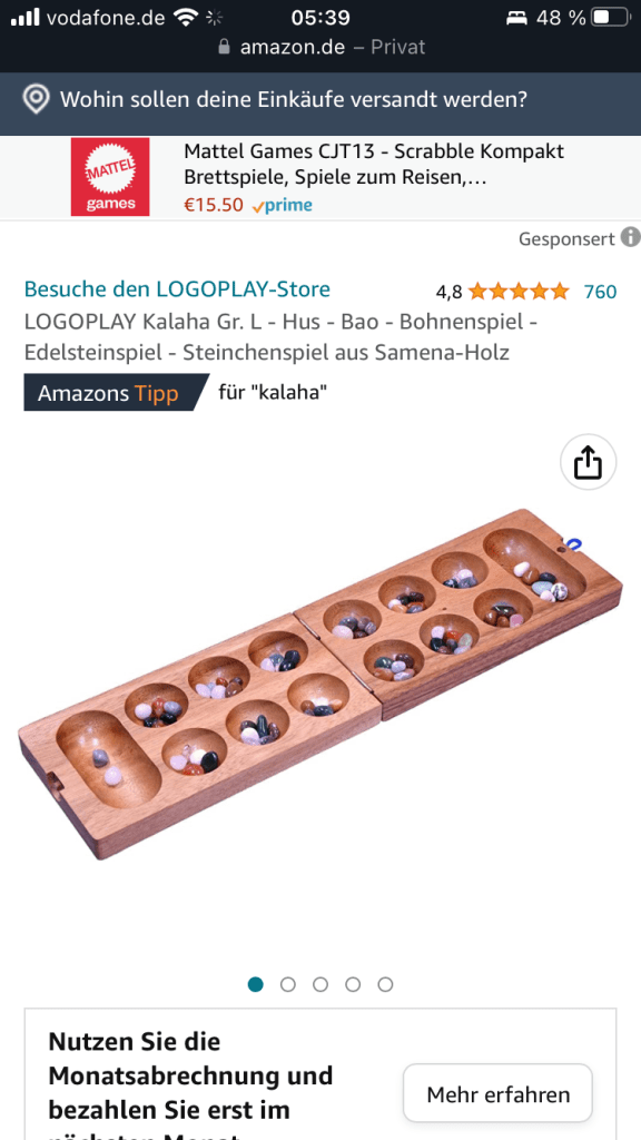 Es heißt Kalaha und es kommt wohl aus Afrika. Ehrlich gesagt bin ich ziemlich begeistert. Man kann es überall spielen. In Afrika braucht man nur 14 Kuhlen und 72 Steine, Bohnen oder Erbsen. Was gerade so da ist.