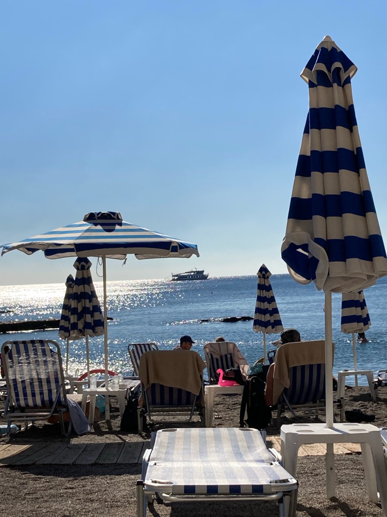 Der Weg führt steil bergab zum Strand. Irgendjemand hat in dann noch mit einem grünen Tuch bespannt. Wird dieses nass, was an einem Strand am Mittelmeer fast unvermeidlich ist, wird er besonders glitschig und für mich unpassierbar.