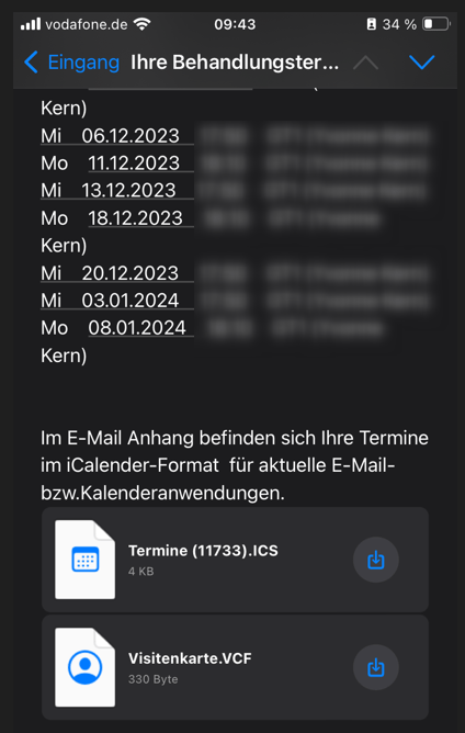 Hier kann ich per Knopfdruck sofort die Termine aus der Bestätigungsmail übernehmen. Und eine elektronische Visitenkarte zum Rückruf gibt es obendrein. So wird das heute gemacht.