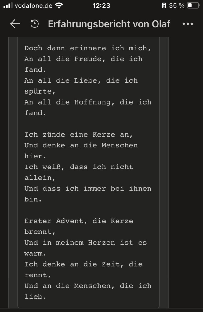 Die Zusammenfassung ist wirklich gut. Was fehlt ist natürlich die menschliche Bewertung. Dass der Blig Menschen in ähnlichen Situationen hilft und Mut macht. 😊 Und das Gedicht: Na ja, hab schon Schlimmeres gelesen. Es bleibt die Frage, warum der Autor eine Kerze anzündet, wenn doch schon eine Adventskerze brennt? Mit dem Zählen hat es Bing wirklich nicht so. Oder ist das schon ein Gedicht für den 2. Advent? 😉