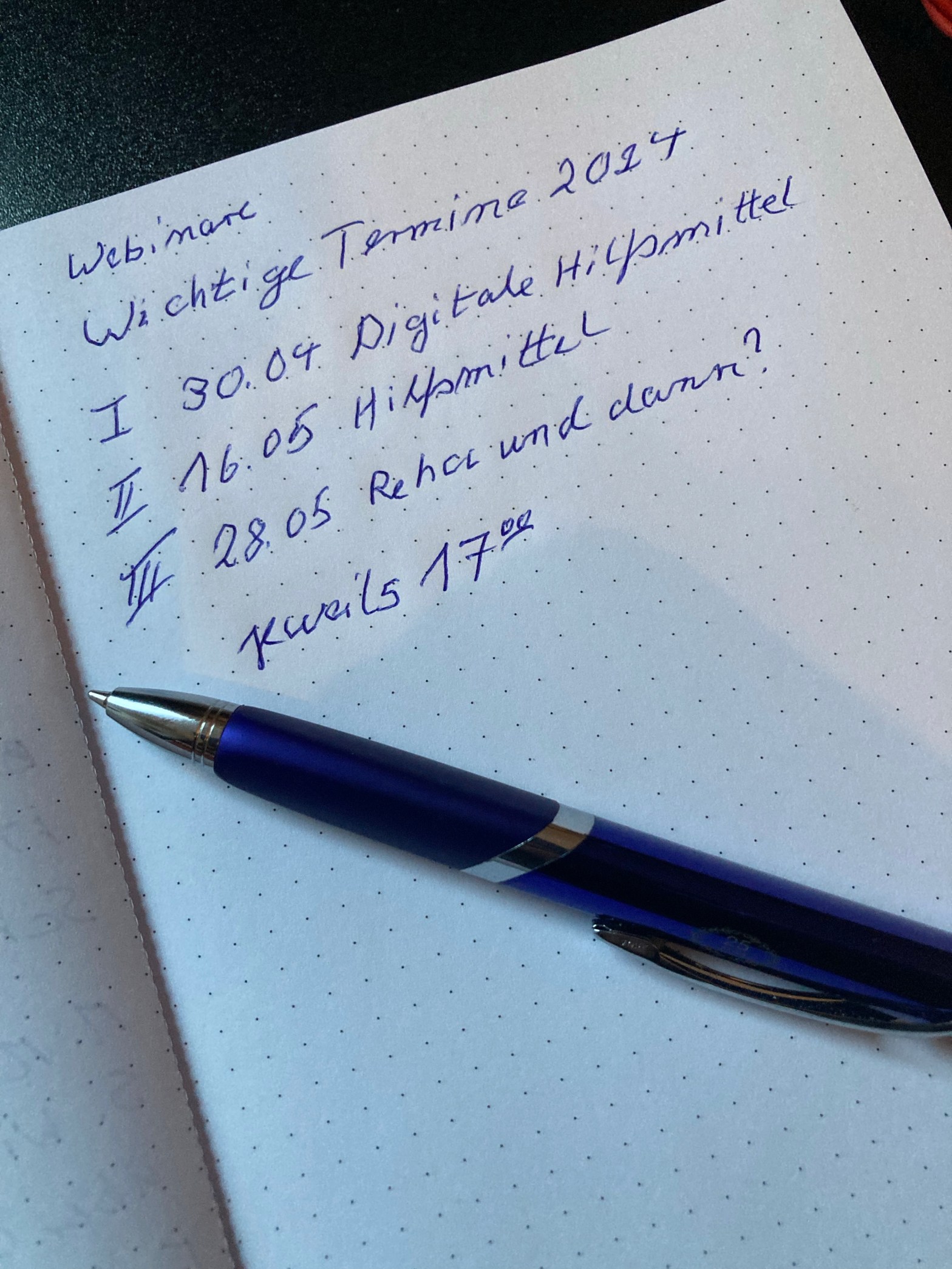 Den Text in mein Arbeitsbuch für 2024 habe ich ganz analog mit meiner betroffenen Hand geschrieben. Bloß keinen der Termine vergessen, das wäre schon sehr peinlich für mich.