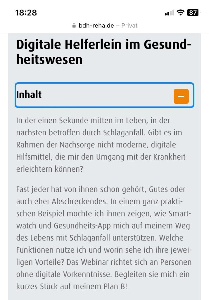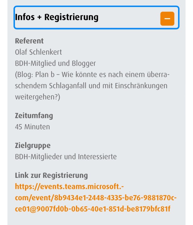 Schaut euch im Forum bitte auch die anderen interessanten Webinare an. Zwei weitere Webinare zu den Tücken der Schlaganfall Nachsorge und der Beantragung von Hilfsmitteln werden im Mai noch folgen. Da hole ich mir dann Verstärkung von zwei kompetenten Juristen des BDH.