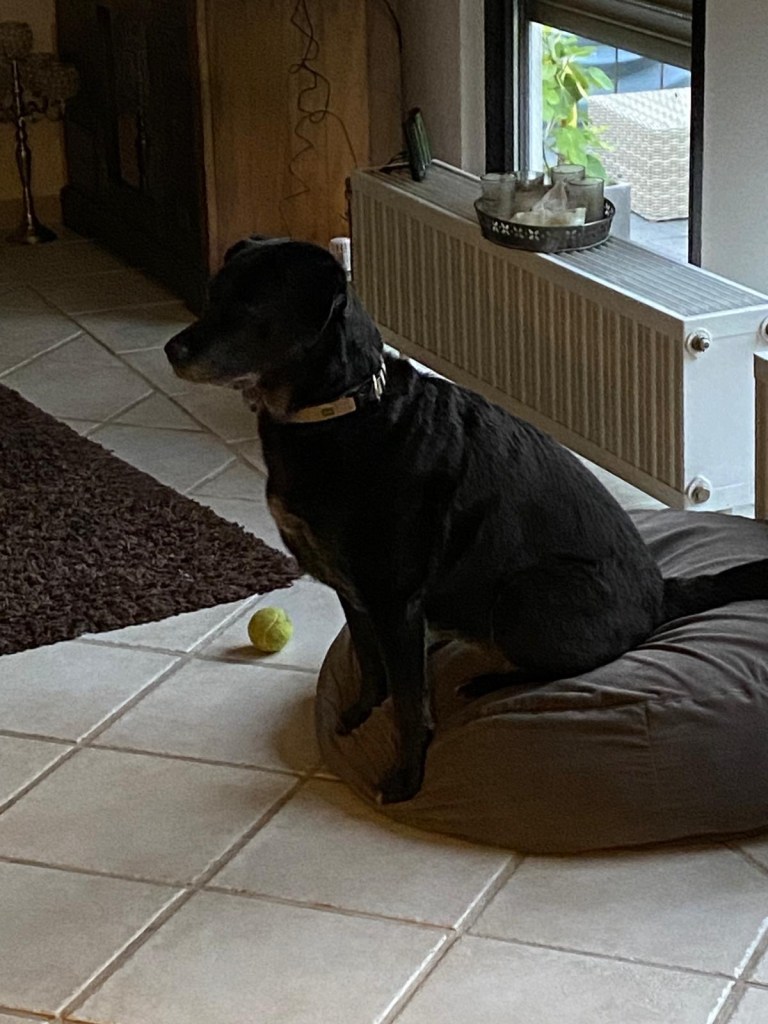 Ihr Name ist Emma, sie ist eine neun Jahre alte Hundedame. Also schon eher gemütlich von ihrem Bewegungsdrang. Aber der besterzogene Hund, den ich kenne. Und diese braunen Kulleraugen.