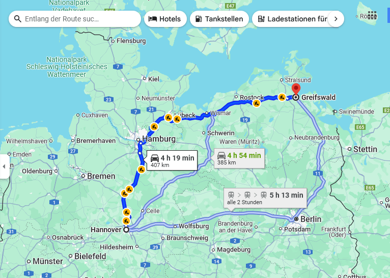 Die Anfahrt nach Greifswald ist mit 420 km gut 200 km kürzer als nach Gengenbach. Von Hannover gerechnet.
