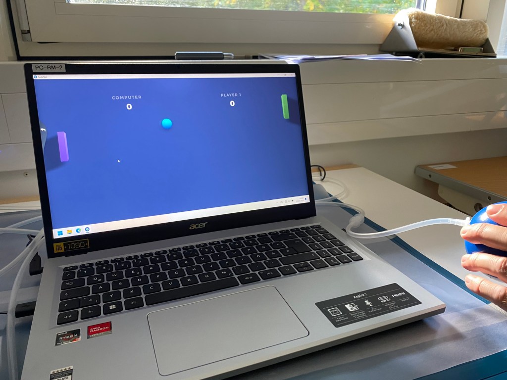 Die Idee mit der Drucksteuerung über zwei Bälle und einen Kompressor ist raffiniert und macht einfach Spaß, zum Beispiel beim Spielen gegeneinander mit seinem Ergotherapeuten beim Pong Spiel. Willkommen in den Siebzigerjahre, in der Vorzeit der Computerspiele. Natürlich wird nur die betroffene Hand verwendet. Genau im richtigen Moment muss man genau das richtige Maß an Kraft mit der Hand auf den Ball ausüben, um den Cursor auf und ab zu bewegen. Gar nicht einfach.