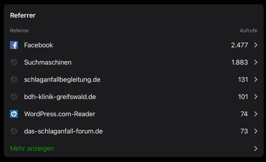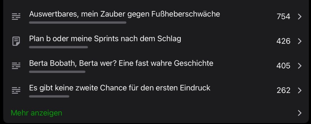 Der nächsterfolgreiche Beitrag ist der Übersichtsartikel über meinen Schlaganfall, dicht gefolgt von dem Artikel über Bertha Bobath. Den mag ich persönlich am allerliebsten.