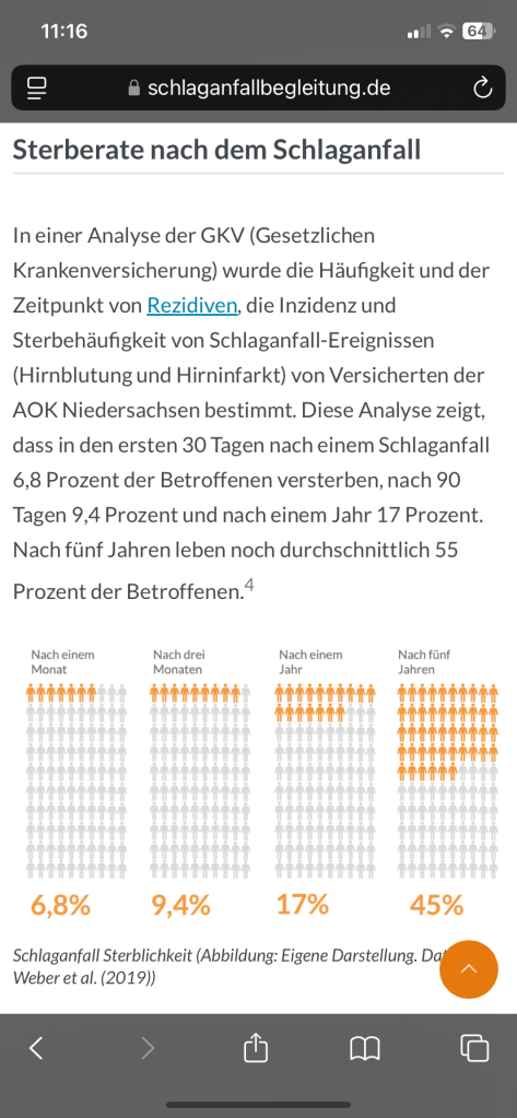 Und ein weiteres hochemotionales Thema habe ich erst spät erkannt. Die hohe Sterblichkeit beim Schlaganfall. Dies ist sicher auch dem hohen Anteil hochbetagter als Schlaganfallbetroffene geschuldet. Nun, ich habe überlebt. Und ich bin ein anderer geworden.