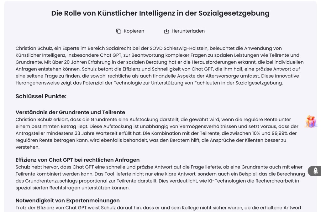 Christian Schulz, ein Experte im Bereich Sozialrecht bei der SOVD Schleswig-Holstein, beleuchtet die Anwendung von Künstlicher Intelligenz, insbesondere Chat GPT, zur Beantwortung komplexer Fragen zu sozialen Leistungen wie Teilrente und Grundrente. Mit über 20 Jahren Erfahrung in der sozialen Beratung hat er die Herausforderungen erkannt, die bei individuellen Anfragen entstehen können. Schulz betont die Effizienz und Schnelligkeit von Chat GPT, die ihm half, eine präzise Antwort auf eine seltene Frage zu finden, die sowohl rechtliche als auch finanzielle Aspekte der Altersvorsorge umfasst. Diese innovative Herangehensweise zeigt das Potenzial der Technologie zur Unterstützung von Fachleuten in der Sozialgesetzgebung.