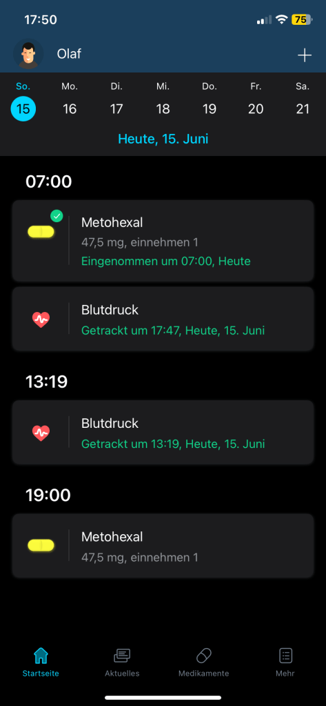 Einige Medikamente betreffen dabei meinen Blutdruck. Da liegt es auf der Hand, diesen auch regelmäßig zu messen. Auch hierfür erhalte ich jetzt eine Erinnerung auf das Handy und die Uhr. Erfasste Werte werden automatisch mit Apple Health synchronisiert. Eine grafische Auswertung gibt es natürlich auch. Meinem Hausarzt könnte ich vor der nächsten Visite die Werte in einer Mail zur Verfügung stellen. Finde ich ziemlich praktisch.