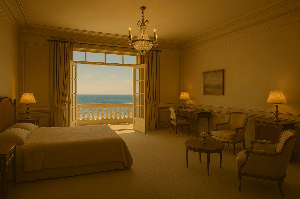 Zimmer 204 öffnete sich mit einem schweren Schlüssel. Innen: hohe Decken, cremefarbene Tapeten mit floralen Mustern, ein Himmelbett mit Baldachin aus Seide. Die Fensterläden standen offen, und die salzige Brise des Meeres ließ die Vorhänge tanzen. Auf dem Sekretär lag ein Briefpapier mit dem Wappen des Hotels, daneben eine Kristallkaraffe mit Cognac.
