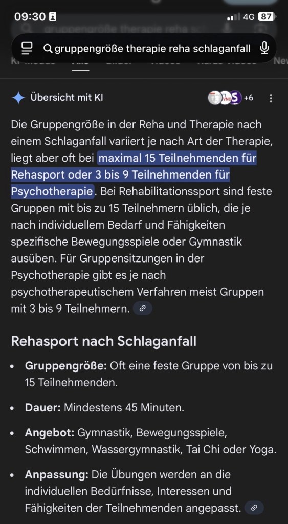 In der Reha wird viel in Gruppen gemacht. Hier ist die Gruppengröße und die Gruppenzusammensetzung entscheidend. In Bad Driburg vor zwei Jahren war ich viel in der Sporthalle. Gruppenschlüssel 1 zu 12. Neben zwei Schlaganfallfällen viele orthopädische Patienten.