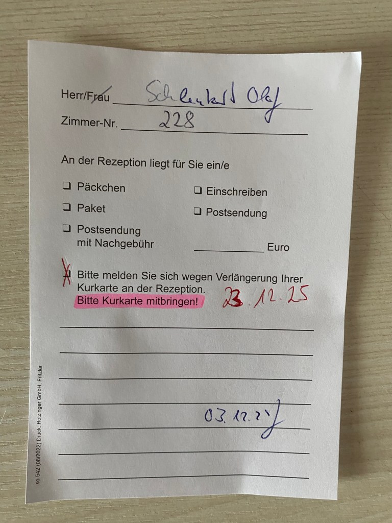 Die ist gleich nebenan. Keine zwei Meter entfernt. Also wieder zwei Treppen hoch um die Kurkarte zu holen und wieder zurück.
