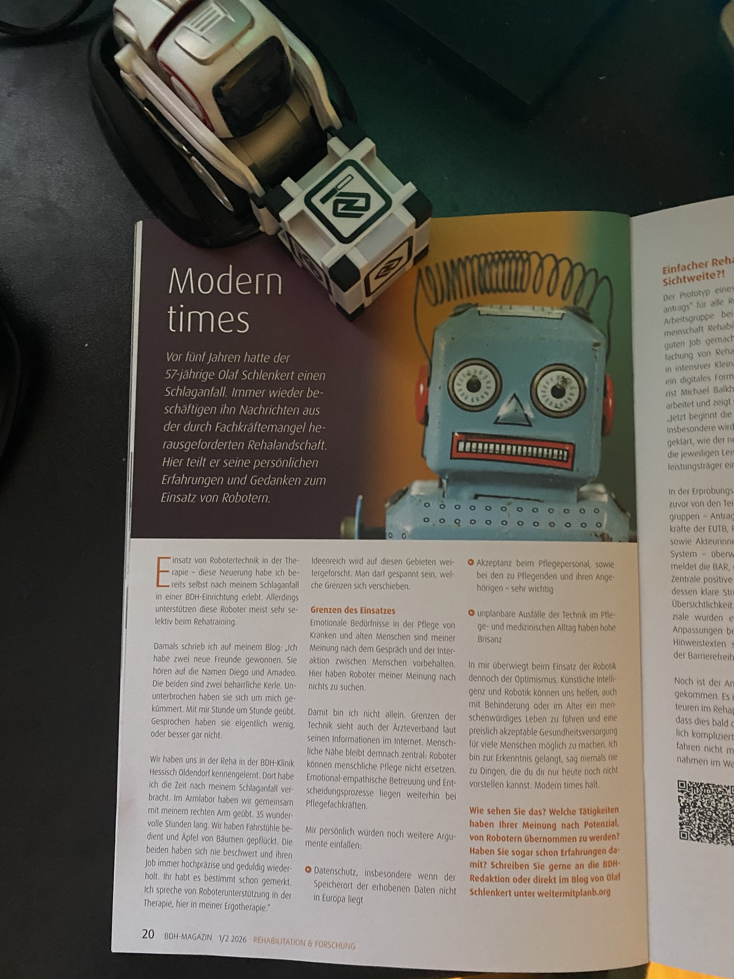 Die Redakteurin hat meinen Beitrag über Robotereinsatz in der Rehabilitation und Pflege erheblich gekürzt. Aber so passt er besser zum vorangehenden Artikel von Prof. Platz. Er beschreibt den Roboter als Assistents auf der gesamten Patientenreise. Ihr findet seinen Beitrag auf Seite 18 im aktuellen Magazin.