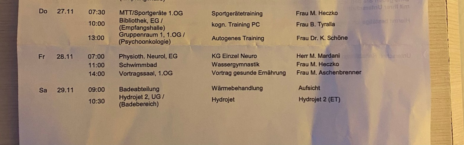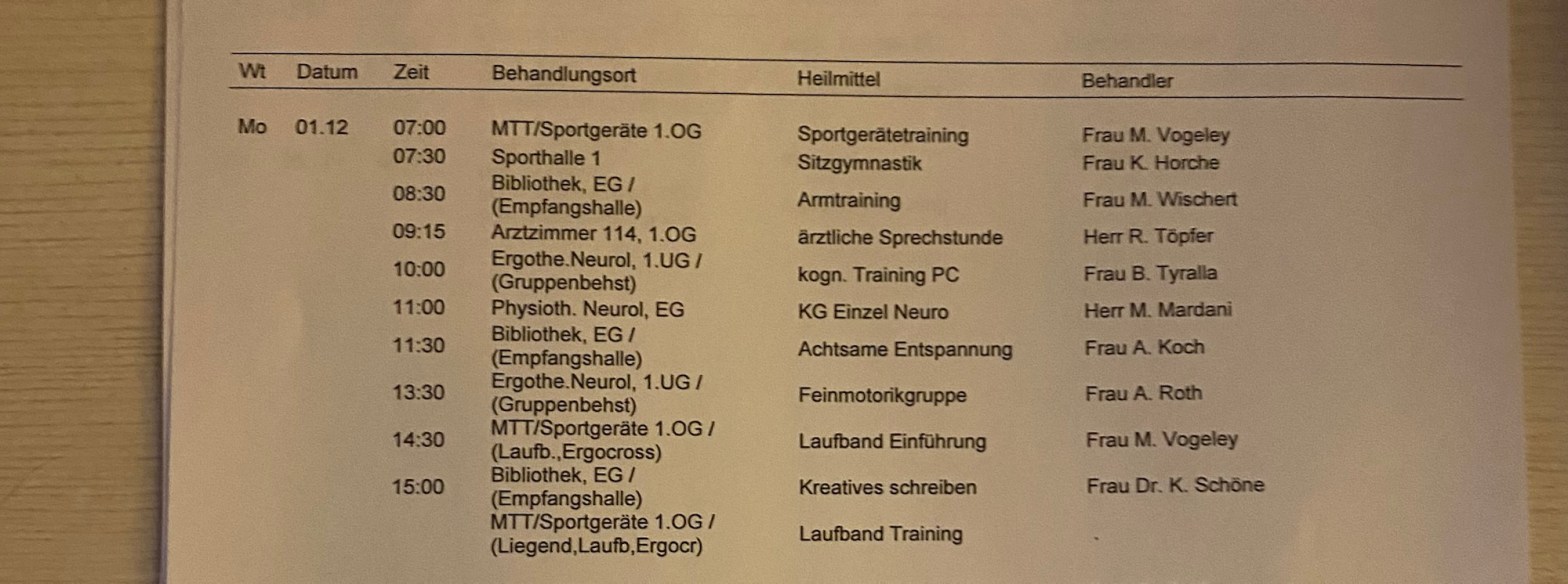 Der neue Wochenplan war im Fach meiner Reha. Drei Seiten. Wow! Ich kann eine ziemliche Nervensäge sein. Drei Termine am Tag, da bin ich eigentlich im Not operate. Das war in meiner Akutreha anders. Acht bis elf Termine täglich. Sonst wäre ich nicht da, wo ich heute bin. Wir nähern uns hier an. Im MTT„Typischer Tag willkommen“ weiterlesen