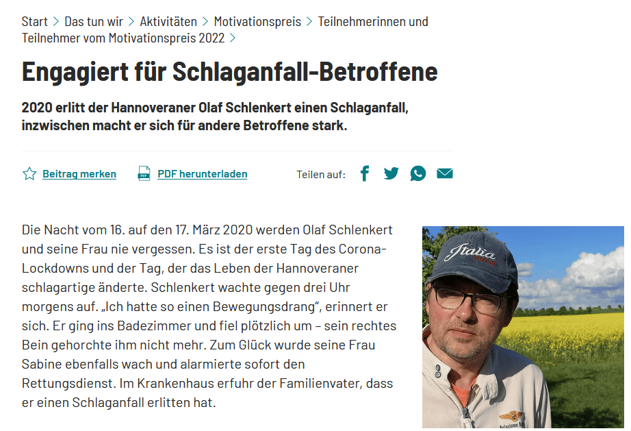 Und jetzt noch etwas in eigener Sache. Ich nehme als Betroffener am Motivationspreis der Deutschen Schlaganfallhilfe in diesem Jahr teil. Heute ist auf deren Seite meine Geschichte erschienen. Das freut mich. Gleichzeitig ist es für mich ziemlich ungewohnt, einfach mal als Leser und nicht als Blogautor von sich selbst zu erfahren. Hier könnt ihr meine„Schon ein Gewinner“ weiterlesen